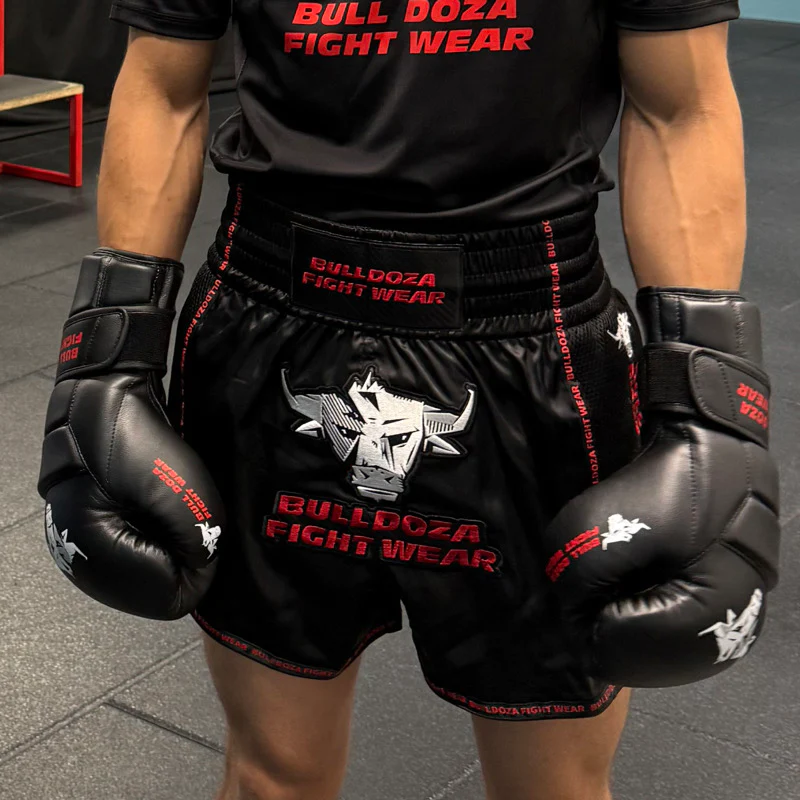 The Bull Doza Blackout Thai Boxing Shorts Carbon Edition are built for war. With a stealth black base, fierce carbon patching, and bold red threading, these are more than just fight shorts theyâre a statement of intent.